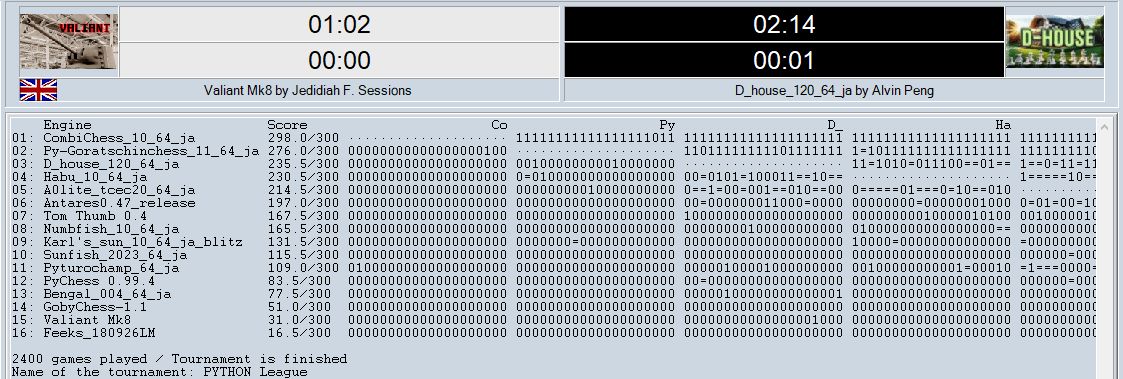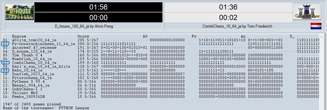 Being very impressed by the evolution of the best TripleBrain in the world (in my PYTHON League tournament) I decided to do a test. CombiChess-1.0_x64_ja has the decision algorithm written in Python and a combo of three analyzing engines (all written in C++: Stockfish-Berserk & Obsidian). A fantastic TripleBrain. Versus the latest Clover (v7.1):